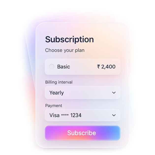 - With smart retries, GST-compliant invoicing, and secure subscription management, we simplify payment cycles for scalable, efficient, and reliable software monetization.